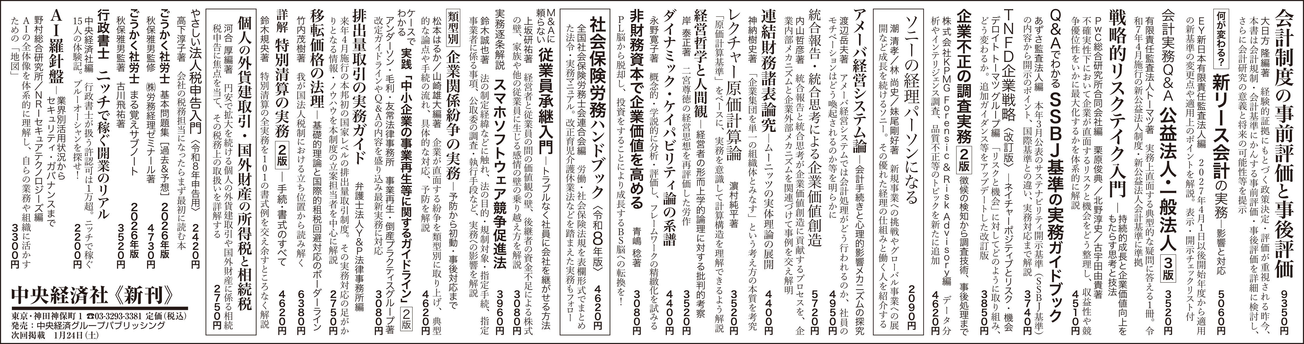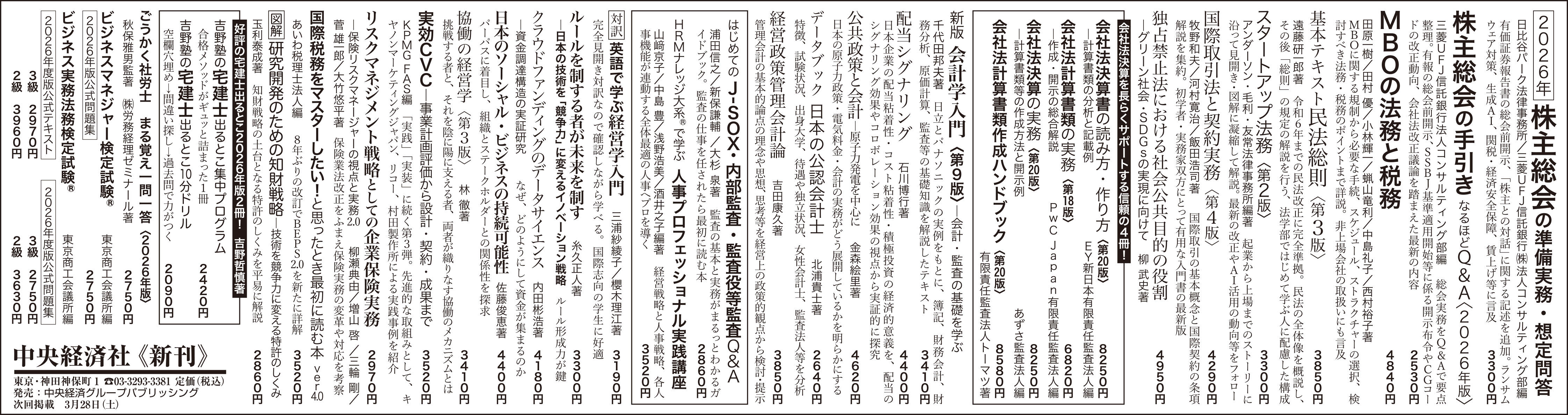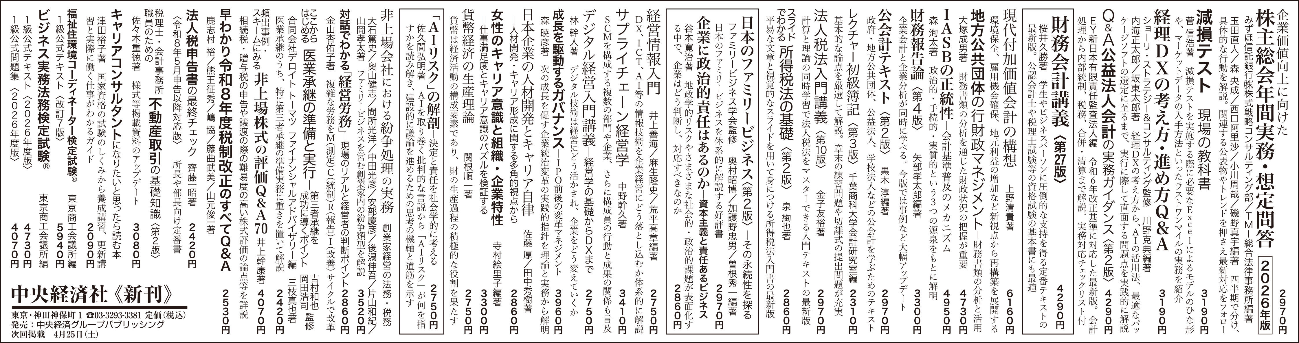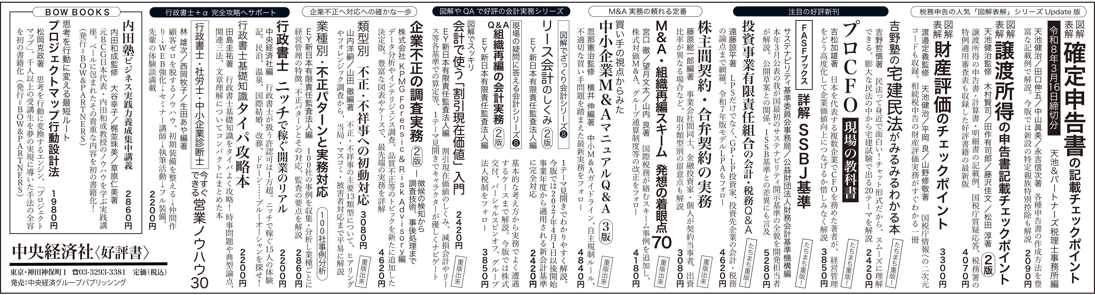 新刊書籍・雑誌は、定期的に新聞広告をしています。とくに毎月第4土曜日の日本経済新聞朝刊は1面全3段を利用した特色ある出版広告です。このほか定期的に雑誌の小枠広告を行っています。