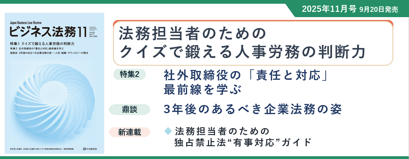 企業法務に求められる役割として,違反行為の防止・コンプライアンスや不祥事発覚時の対応などの「守りの法務」(ガーディアン機能)のみならず,経営や他部門に法的支援を提供することで会社の事業・業務執行を戦略的かつ効率的に実施するための「攻めの法務」(パートナー機能)があるという認識が定着しつつある。このことは,筆者も,社会人大学院で学生と接するなかで,日々,実感している。