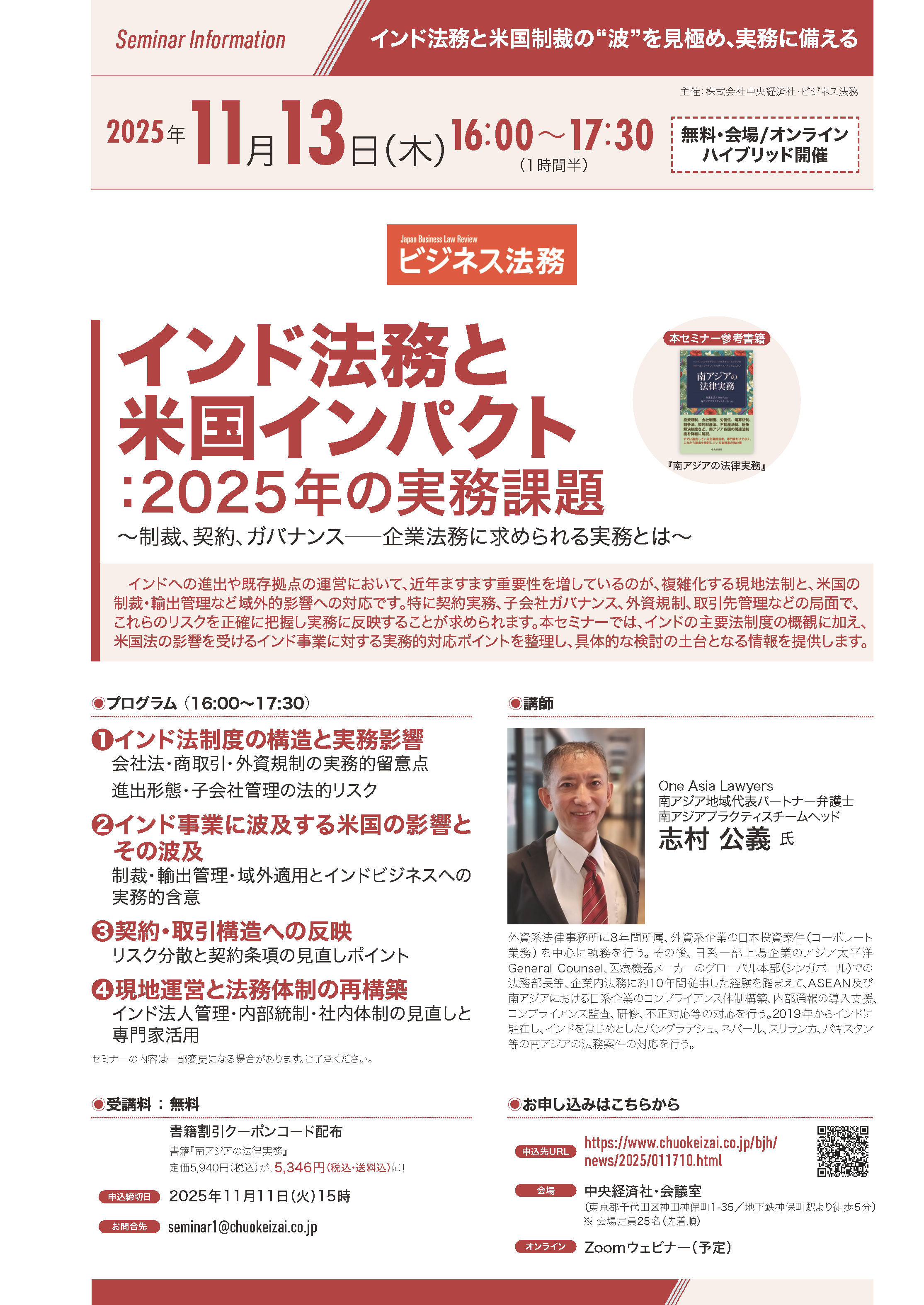 2025年11月13日(木)開催セミナー「インド法務と米国インパクト:2025年の実務課題」