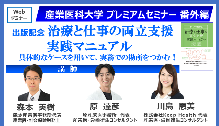 本セミナーでは、『ケースでわかる 治療と仕事の両立支援実践マニュアル』の共著者である森本英樹先生・原達彦先生・川島恵美先生をお迎えし、両立支援の具体的な進め方・留意点を解説します。