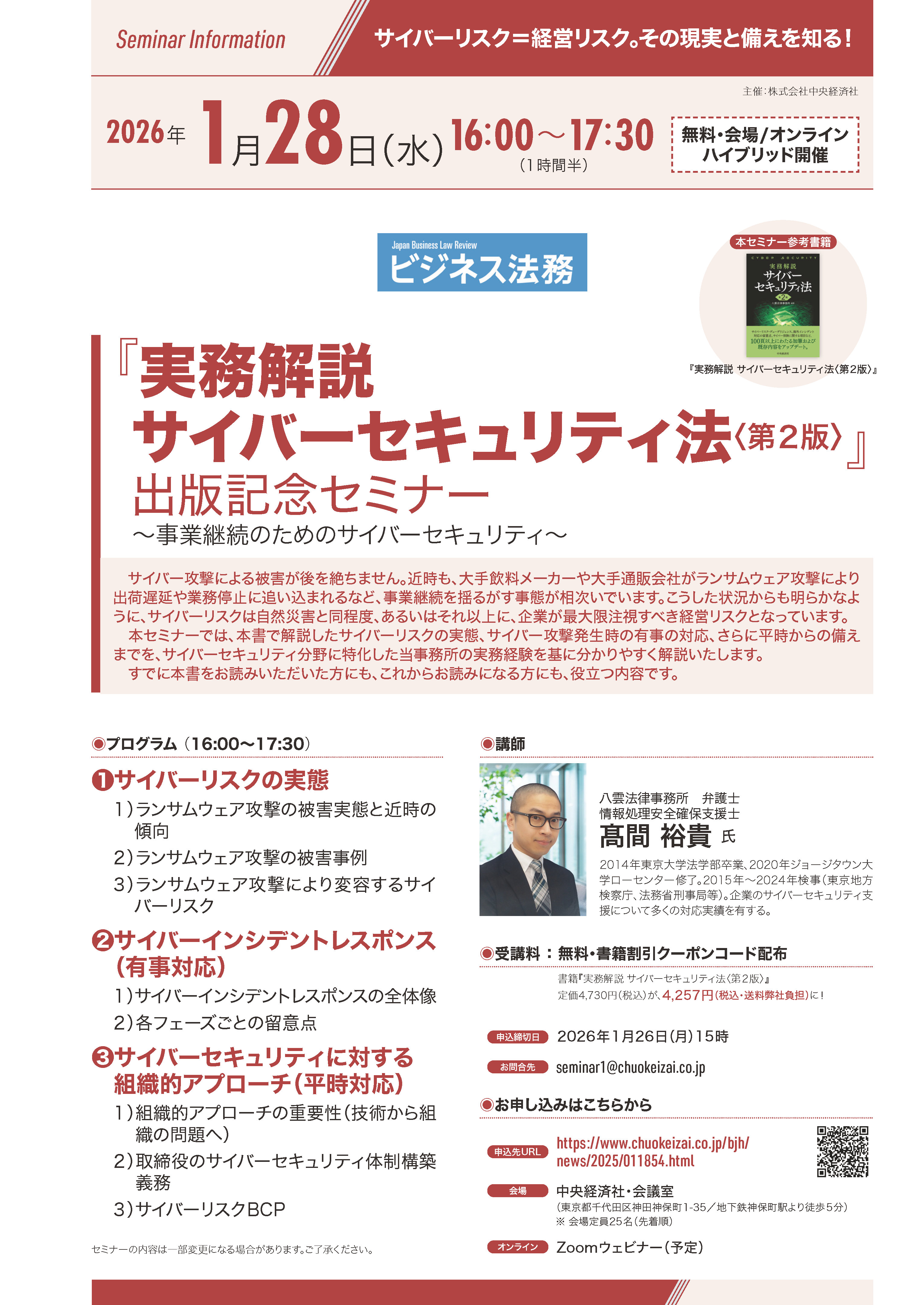 2026年1月28日(水) 『実務解説 サイバーセキュリティ法〈第2版〉』出版記念セミナー