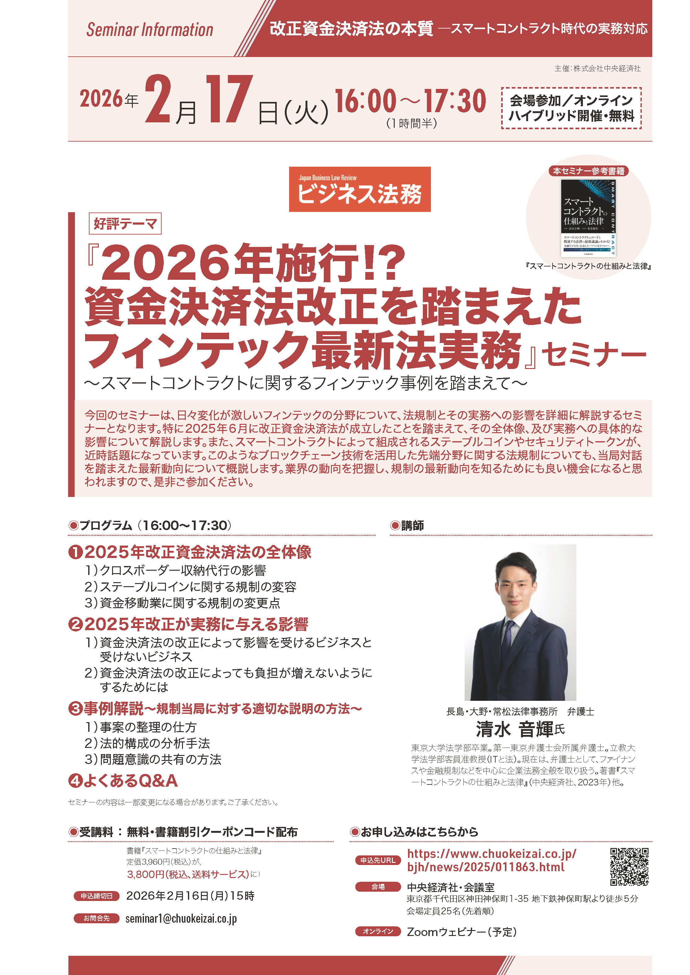2026年2月17日(火)開催 好評テーマ『2026年施行!?資金決済法改正を踏まえたフィンテック最新法実務』セミナー