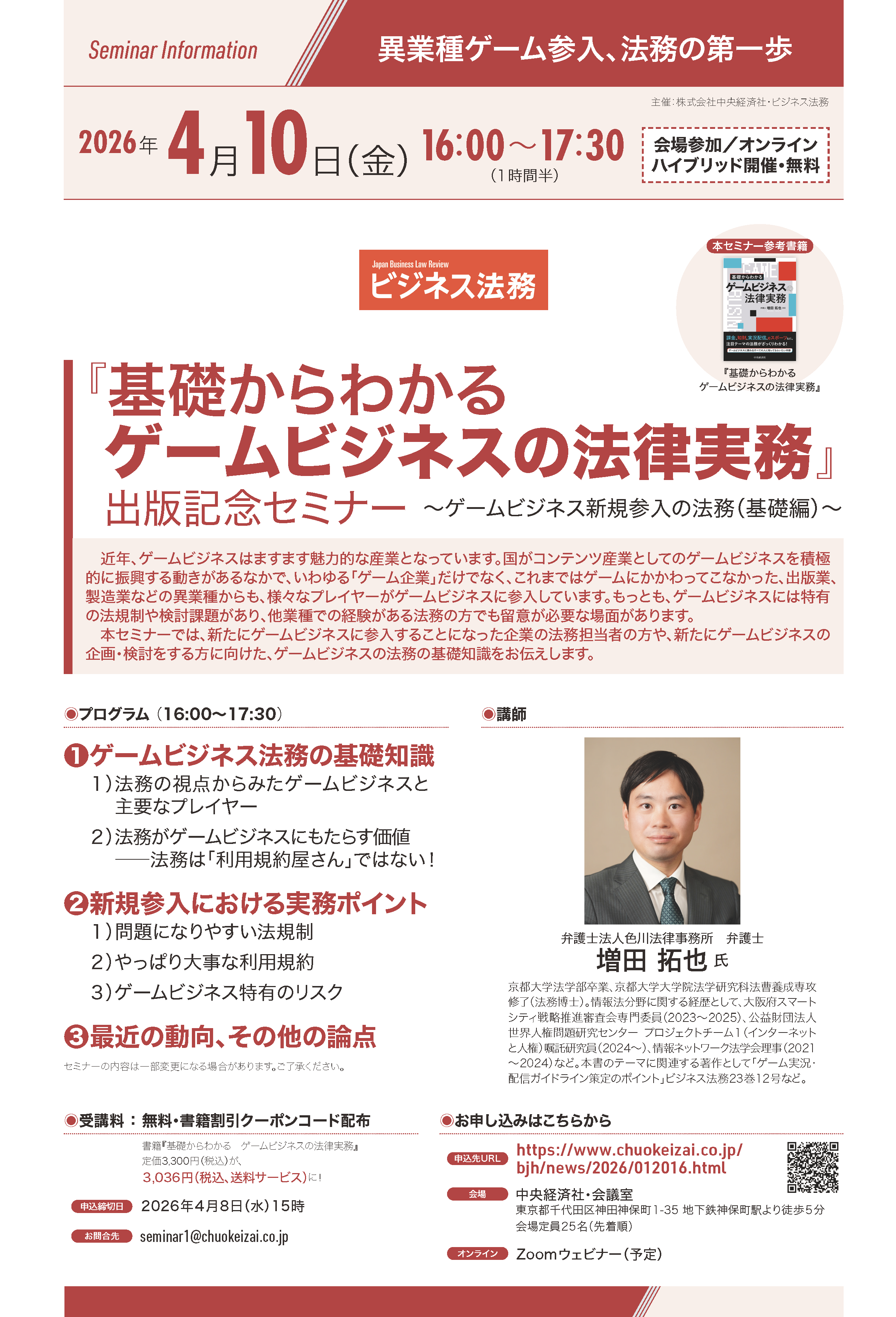 2026年4月10日(金)開催『基礎からわかる ゲームビジネスの法律実務』出版記念セミナー