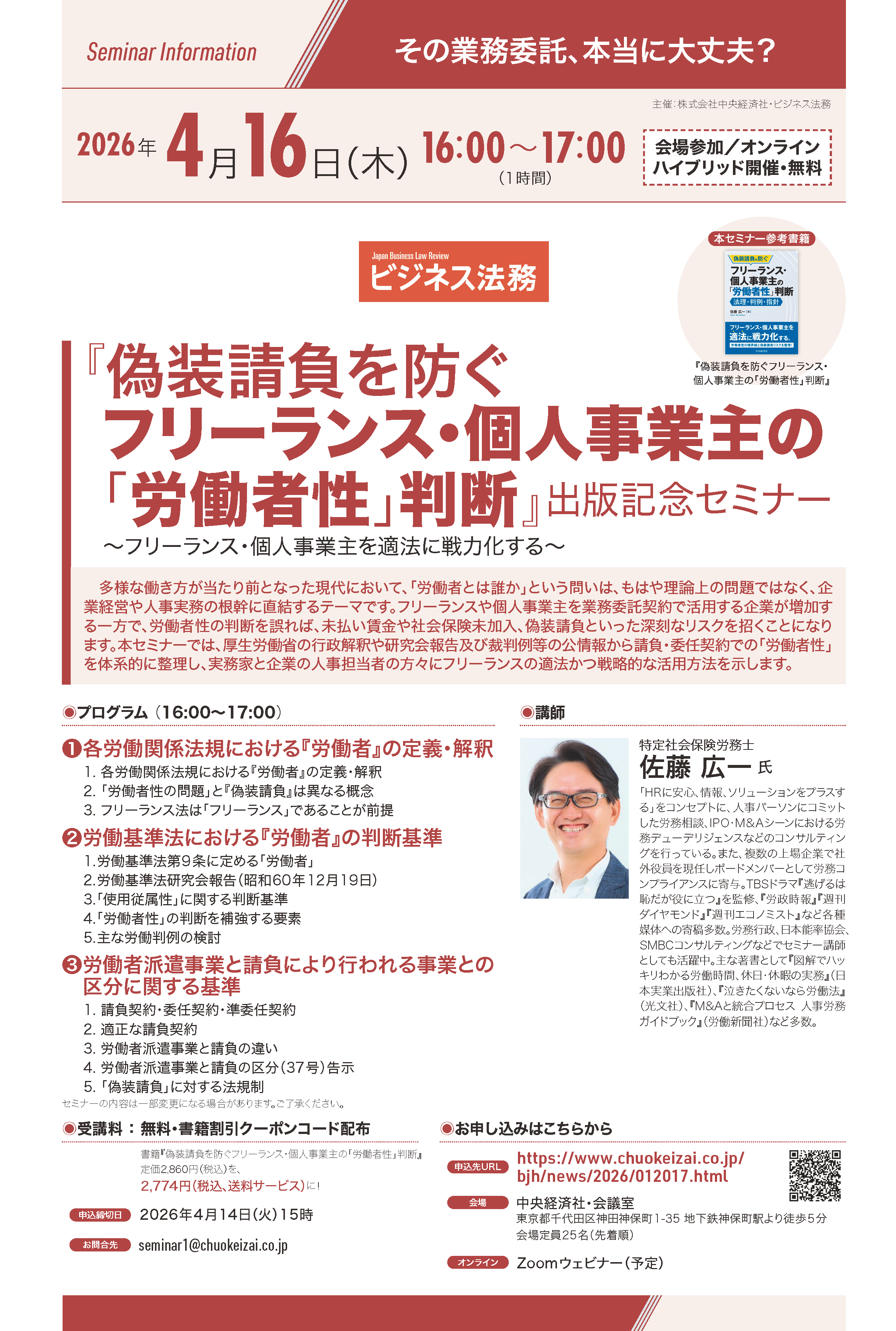 2026年4月16日(木)開催『偽装請負を防ぐ フリーランス・個人事業主の「労働者性」判断』出版記念セミナー