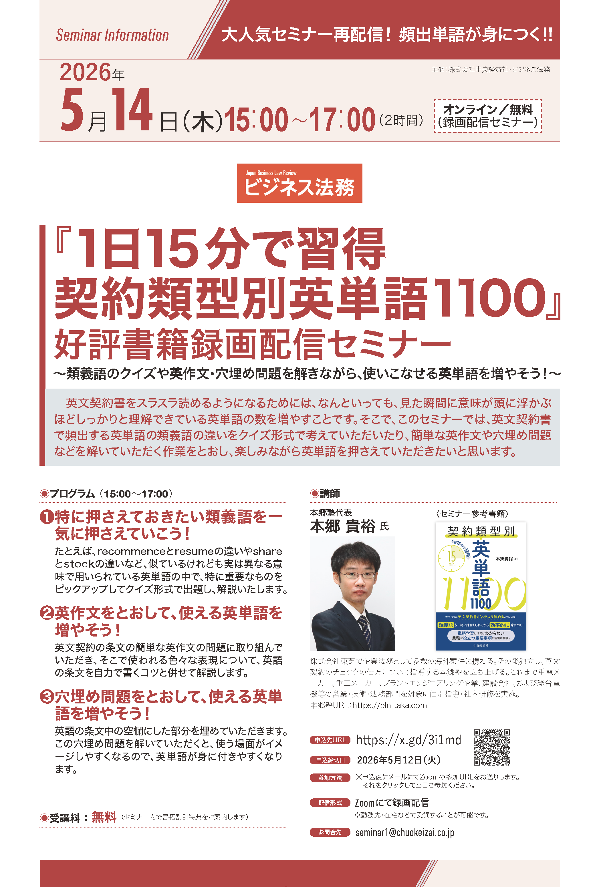 2026年5月14日(木)『1日15分で習得 契約類型別英単語1100』 好評書籍録画配信セミナー