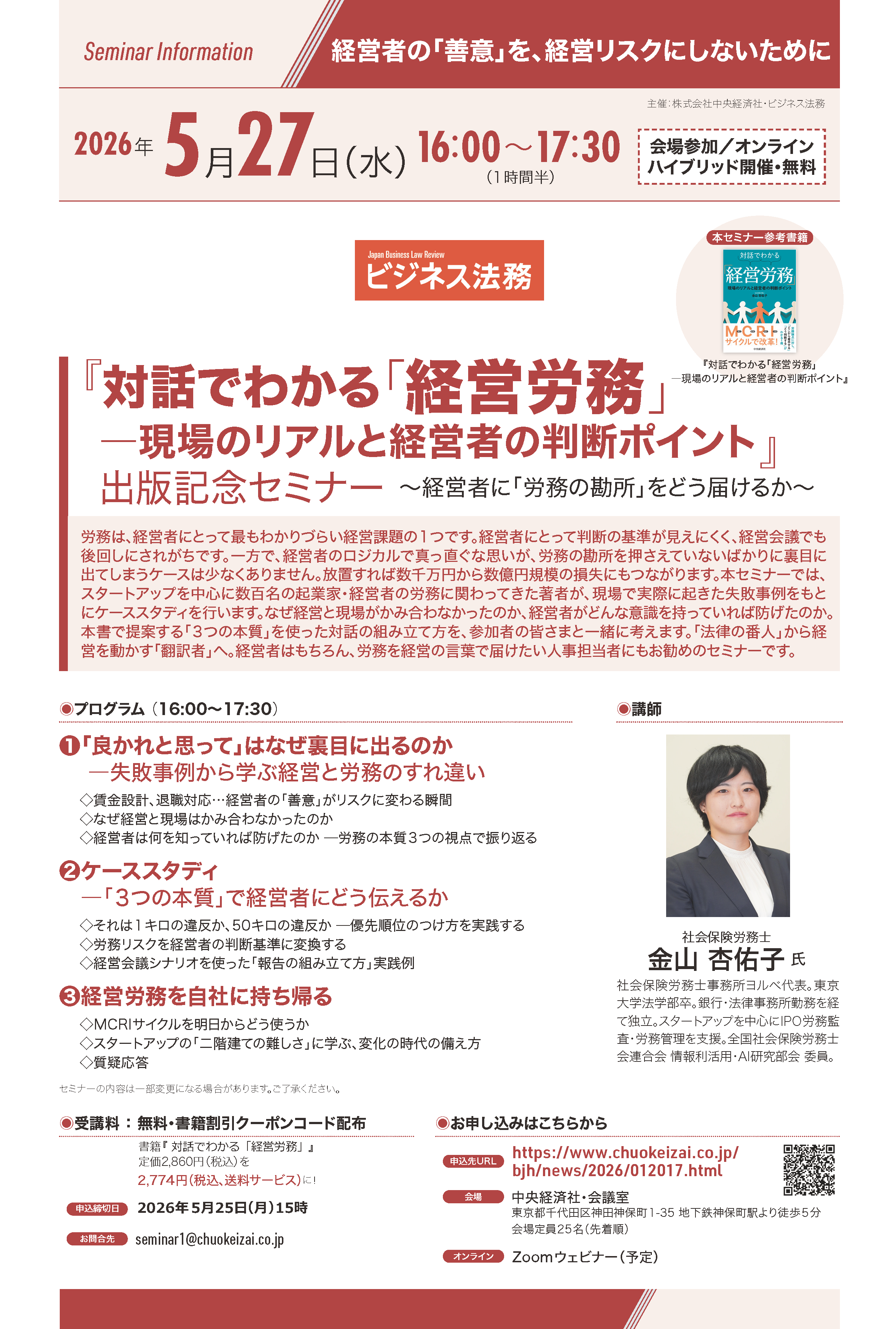 2026年5月27日(水)『対話でわかる「経営労務」―現場のリアルと経営者の判断ポイント』出版記念セミナー