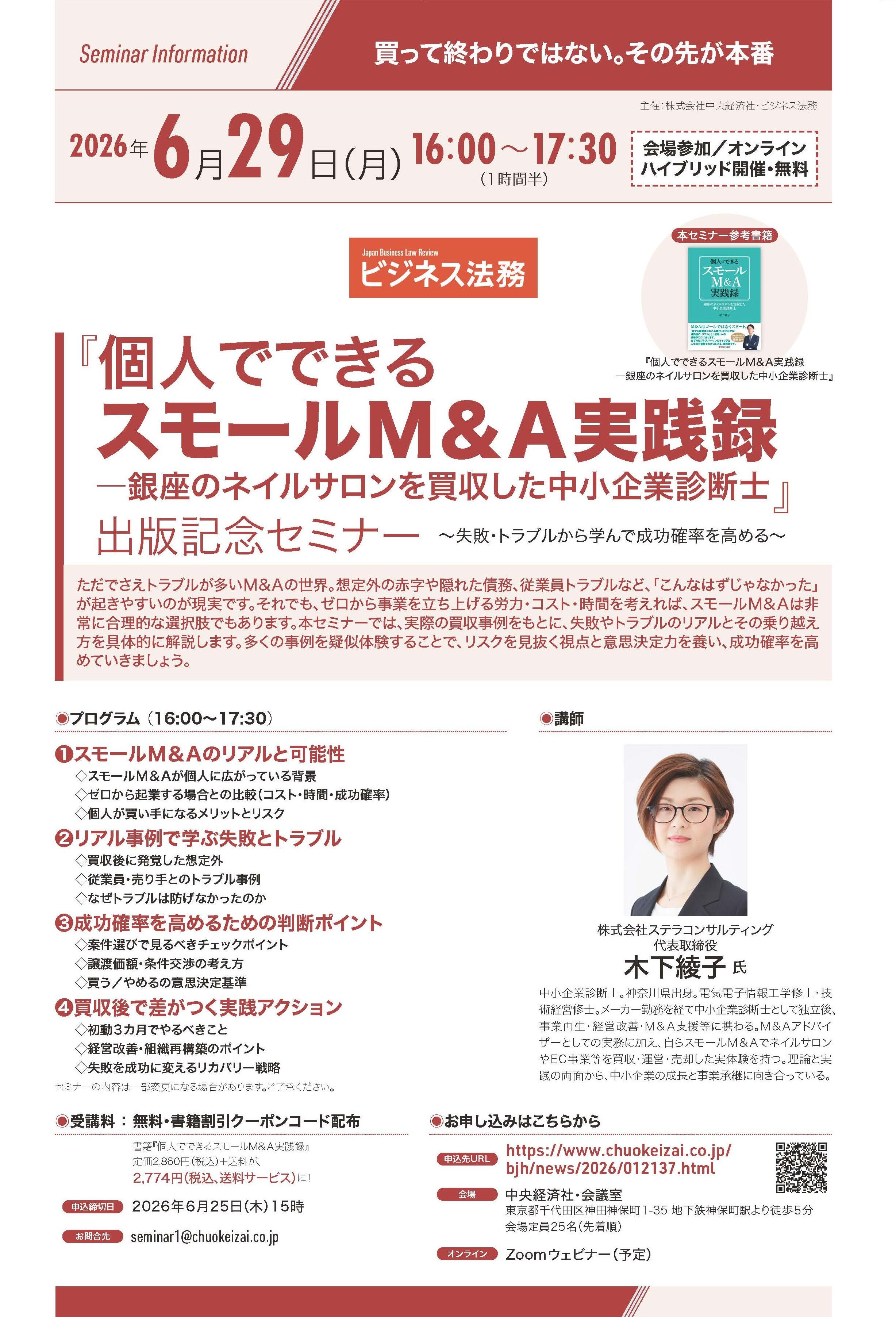 2026年6月29日(月)『個人でできるスモールM&A実践録』出版記念ハイブリッドセミナー